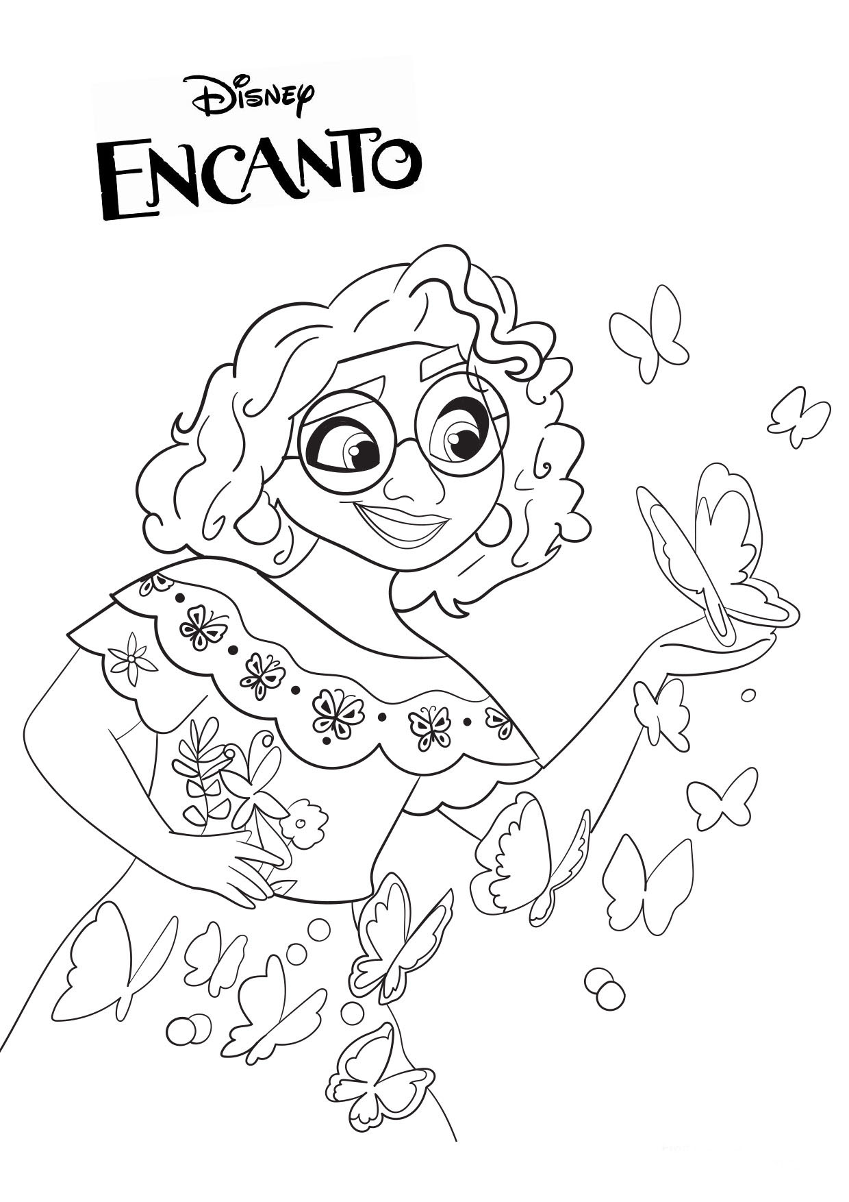 Mirabel juega con mariposas. Dibujos para colorear de Encanto con la familia Madrigal.
